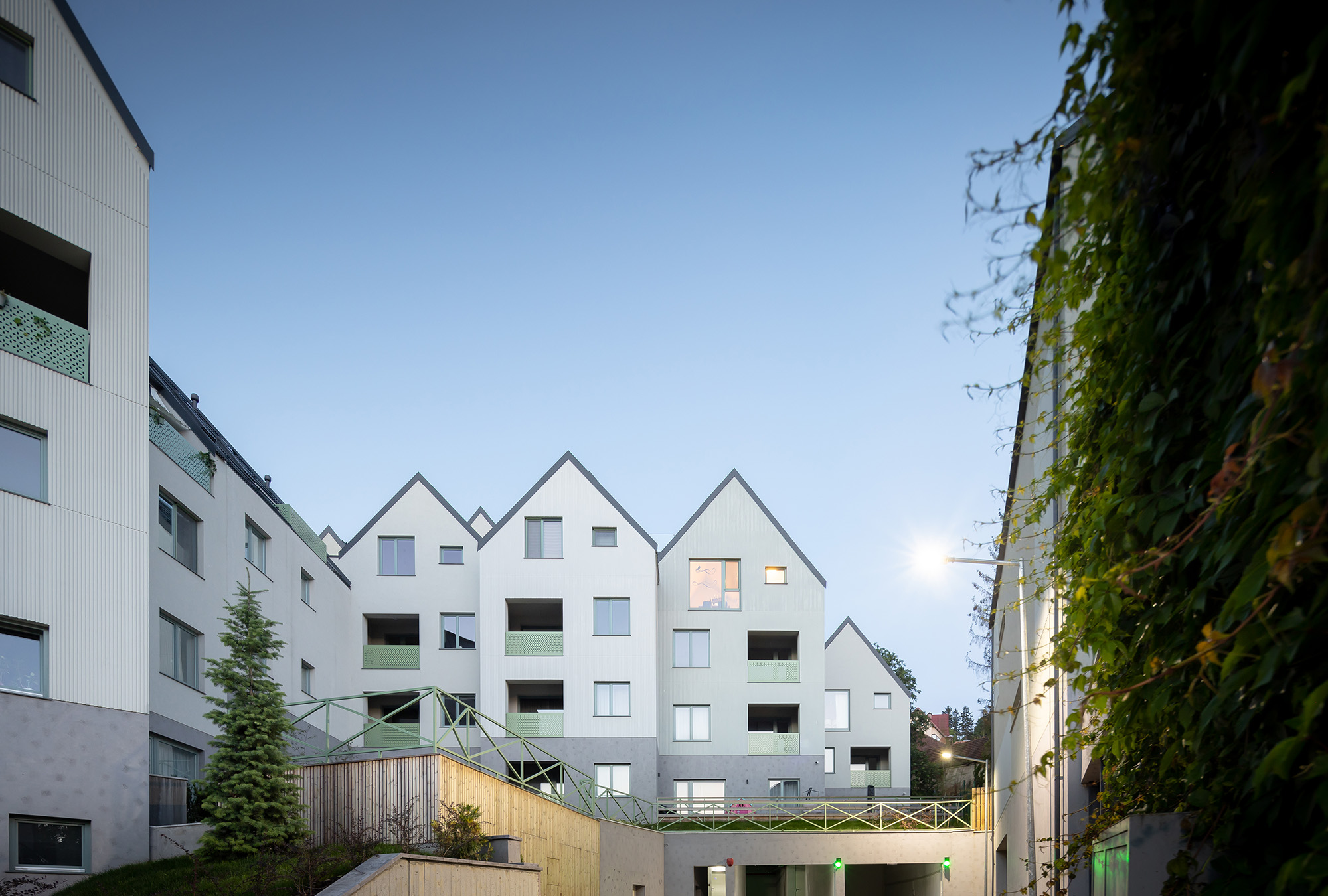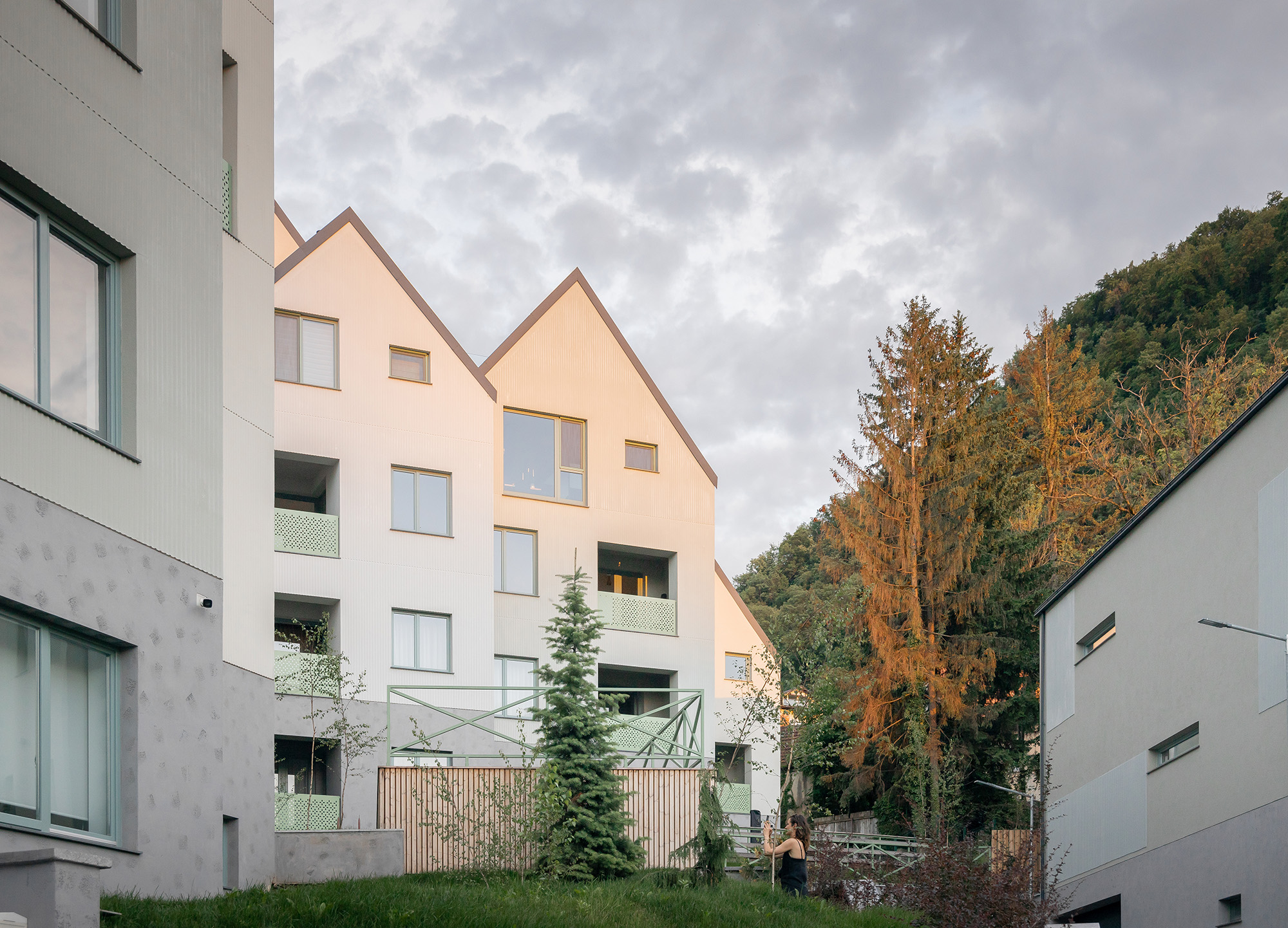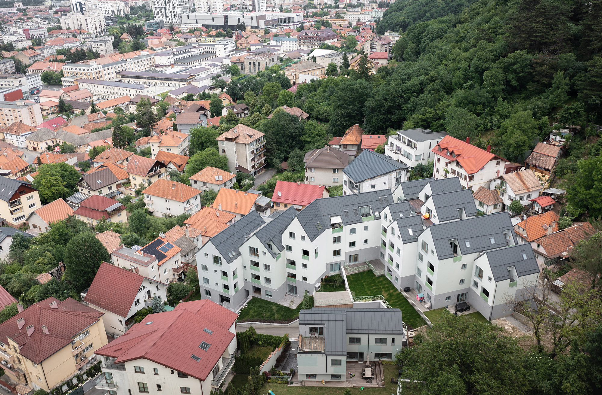Cele 38 de apartamente cu 29 de tipologii, majoritatea duplexuri sau triplexuri, preiau ritmul și scara locuințelor învecinate.