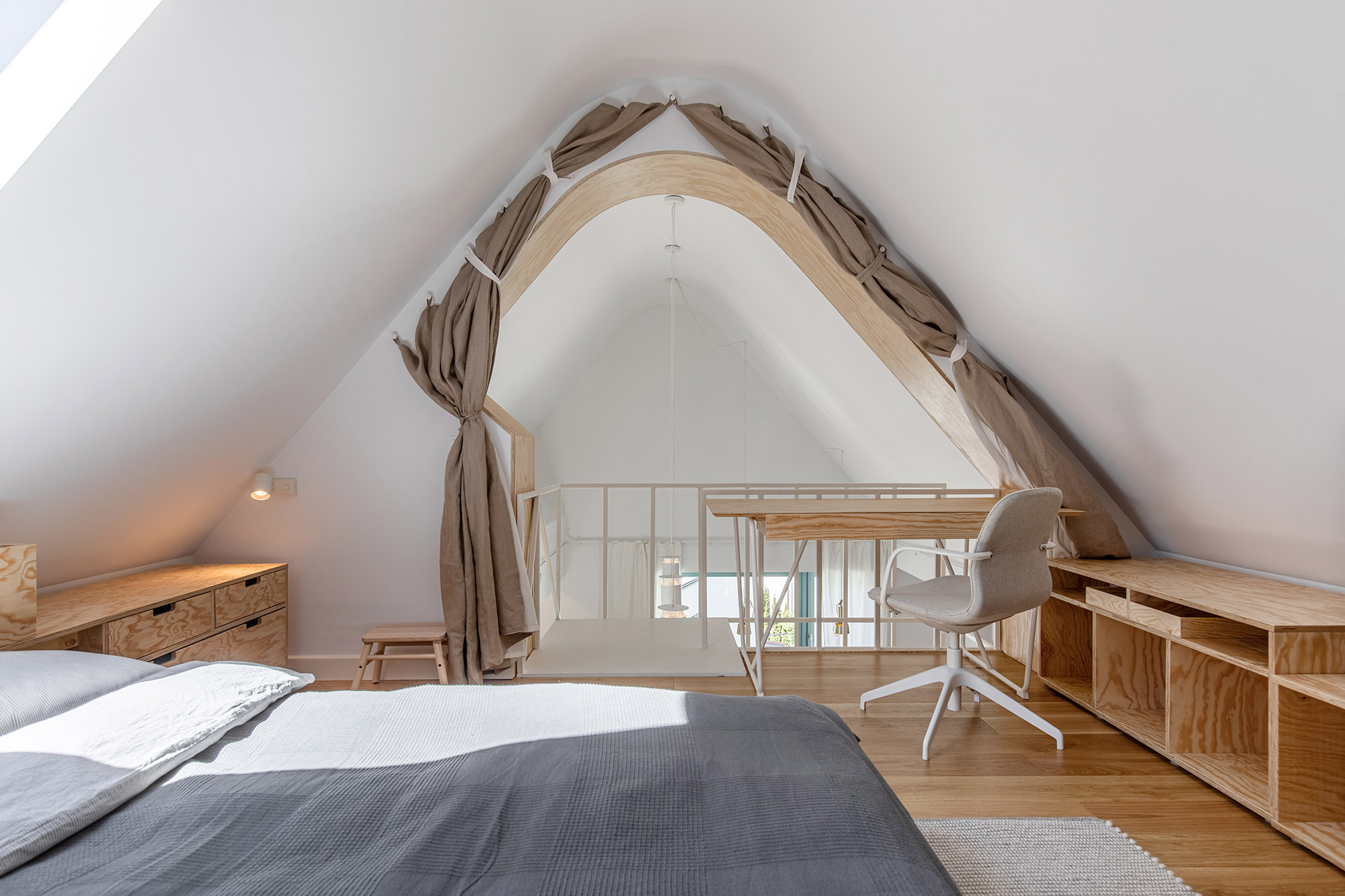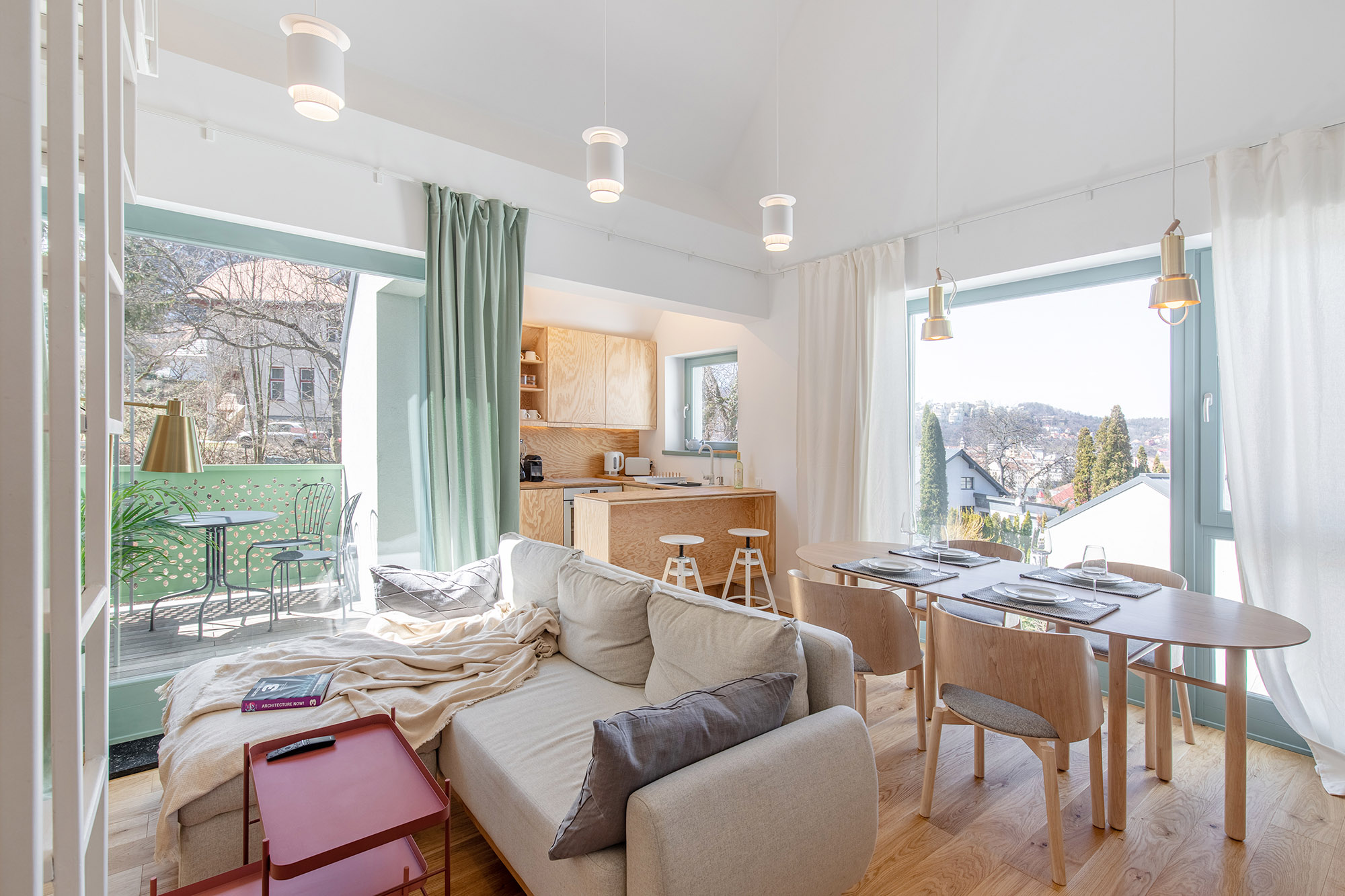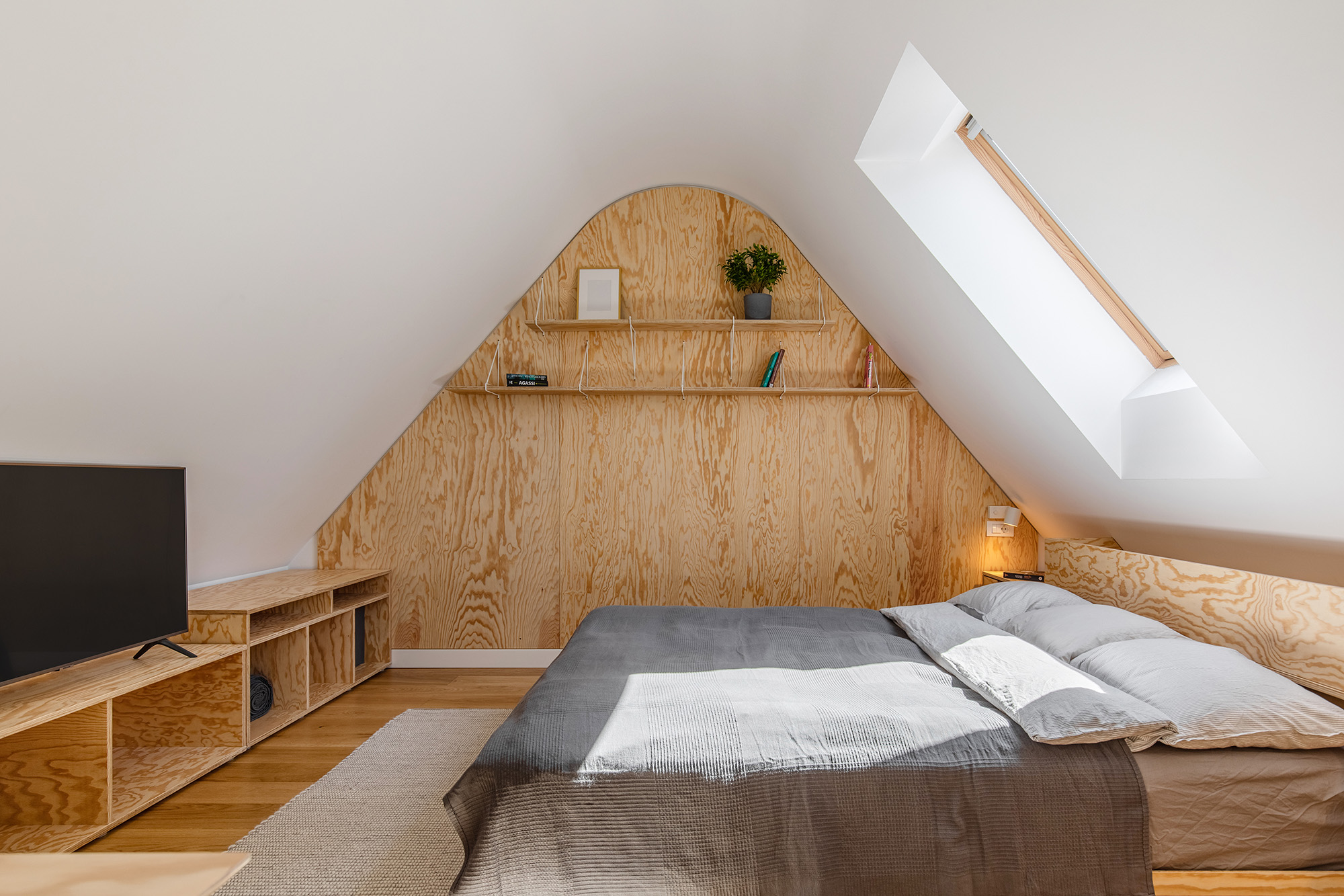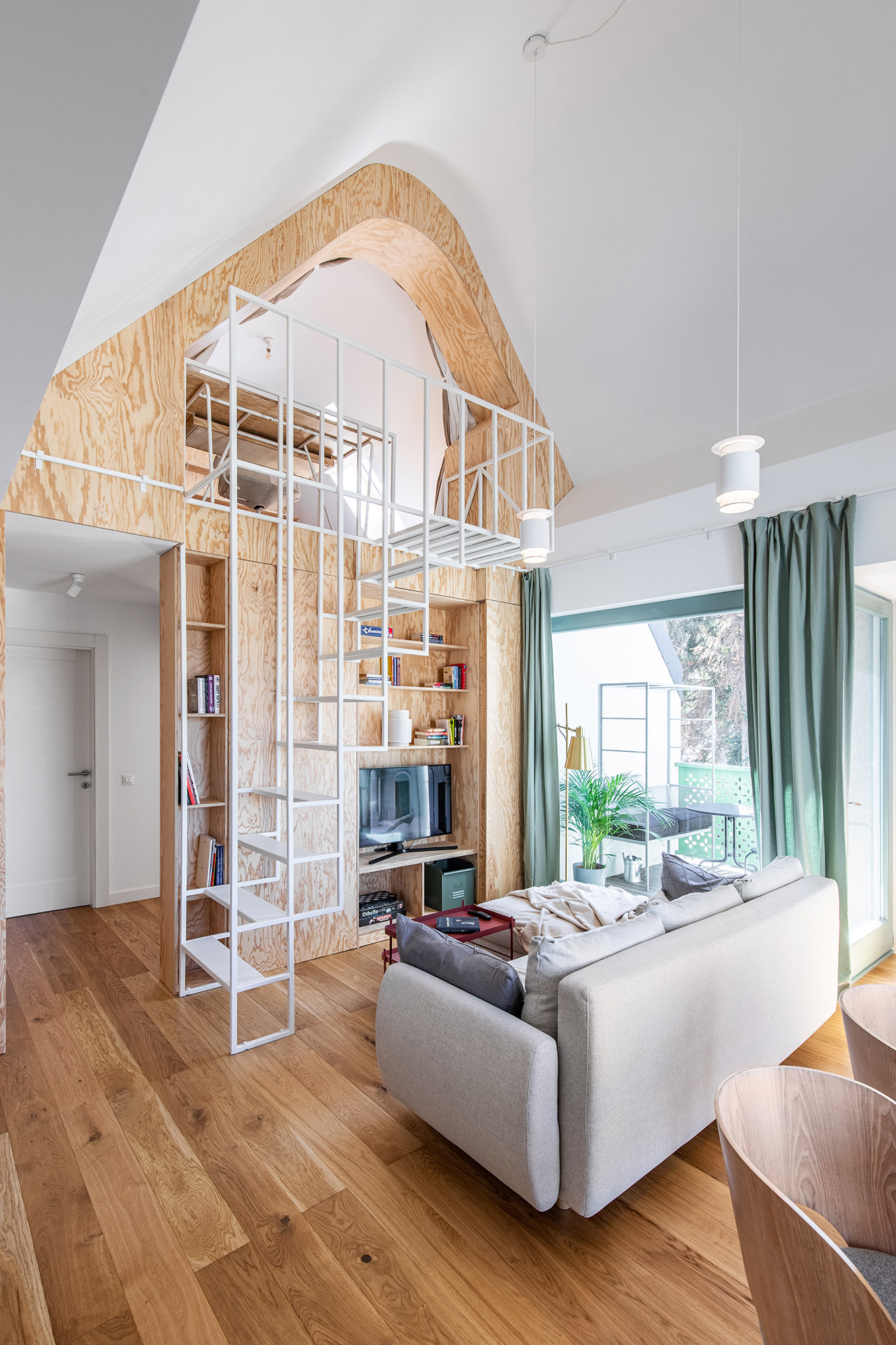 Cele 38 de apartamente cu 29 de tipologii, majoritatea duplexuri sau triplexuri, preiau ritmul și scara locuințelor învecinate.